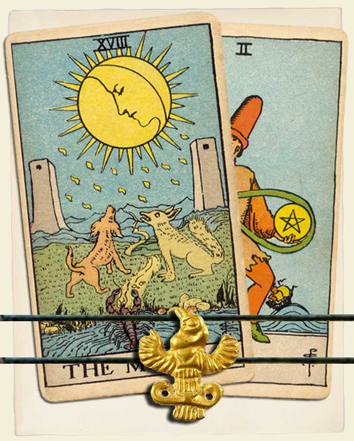 The Moon and Two of pentacles combination means that mystic tarot forces: I) Complexity (The Moon) and II) Balancing Resources (Two of pentacles) are effecting your person at this moment. Those cards together reflect the various cycles of your emotions when dealing with many things at once. Take thing one day at a time. If you succeed in controlling your emotions, you will find that life itself can be eased by your self-reassurance.