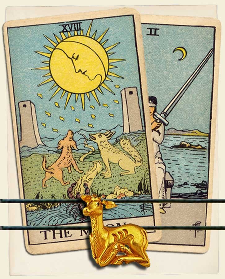 The Moon and Two of swords tarot combination gives you a divination about an event in your future, which is influenced by the arcane tarot forces of (A) CONFUSION and (B) AN IMPASSE. These cards in combination represent a period of introspection which you are reluctance to let go of. It’s OK to remember that you’re human. You cannot hide forever, and you cannot stand still any longer. Be a Queen and move in any direction.