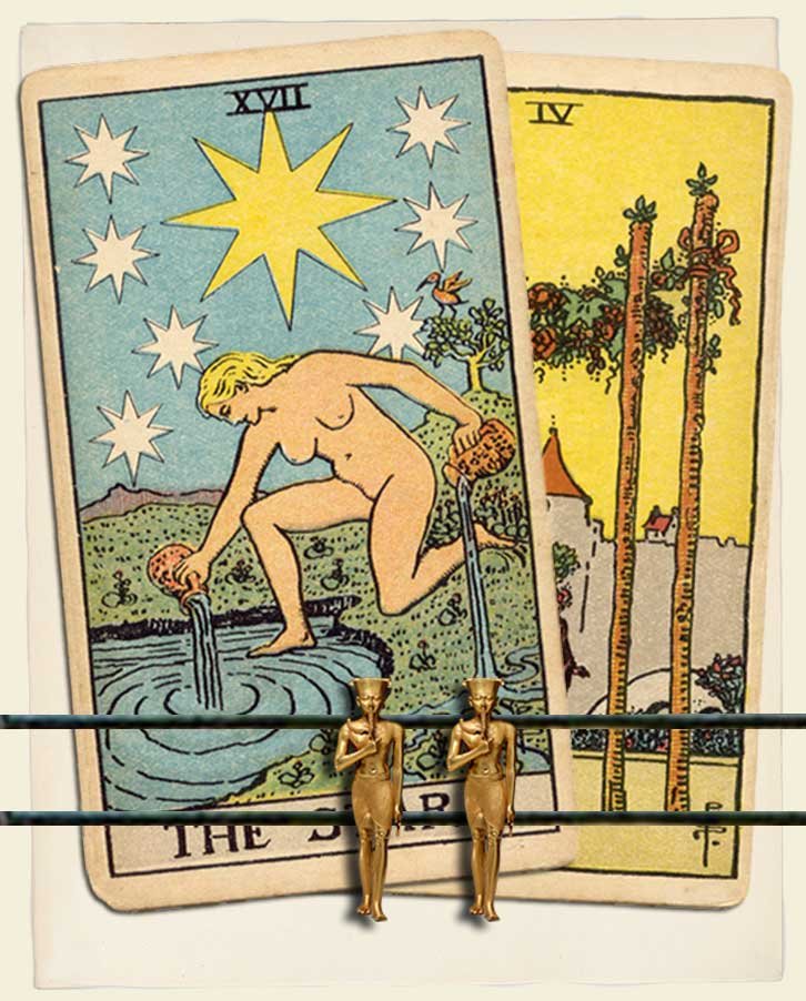 The Star and Four of Wands combination in love and relationships is a very positive omen. This pairing signifies hope, joy, coming together with others who support and love you, remaining true to yourself, and having something important to hope for.