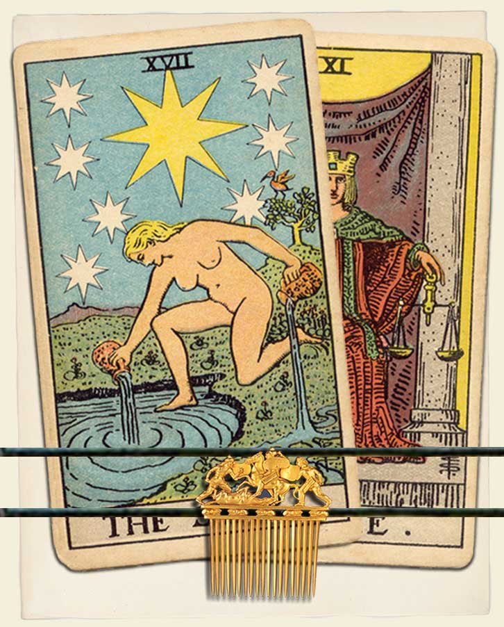 The Star and Justice combination can be a somewhat unsure sign for love and relationships. While The Star influence on love is quite positive, with keywords like hope, generosity, illumination, awakening traveler, and love, the Justice influence may be slightly unfavorable.