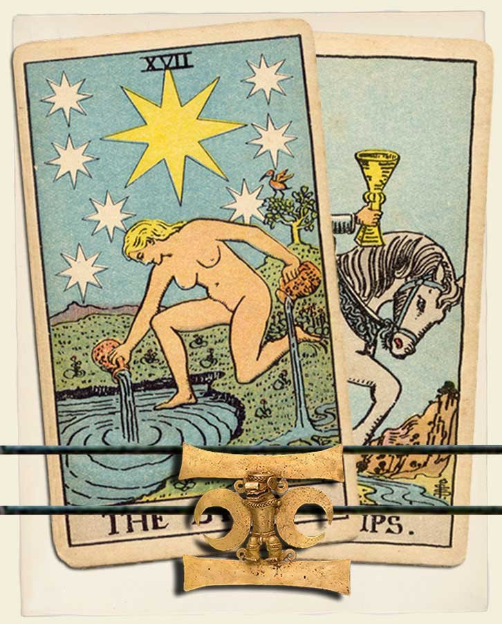 The Star and Knight of Cups combination is a favorable sign for love and relationships. The Star represents deeply felt desires and hopes, while the Knight of Cups embodies intuition. With new-found hope comes an inner confidence never seen before, allowing the real you to be seen by all those who surround you.