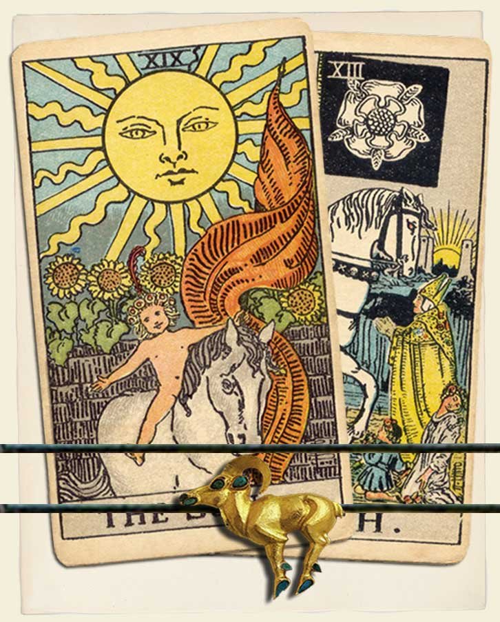 The Sun and Death tarot combination means that arcane tarot forces: A) Vitality (The Sun) and B) Letting Go (Death influence) are jointly affecting you today. These cards in combination have had enough of you wading through your sad past, and want to offer you the transformation of a lifetime. Grab this opportunity to find a you that is bursting to come out. Do things that scare you and shake out your comfort zone.