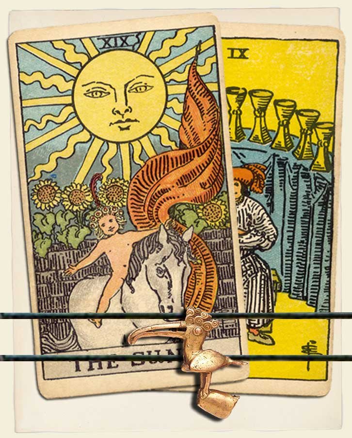 The Sun and Nine of cups tarot combination gives a clearer perception about your actual state and close future, which is directed by the guiding influences of (1) Fun and (2) Wish Come True (effect of Nine of cups). These cards in combination are giving you everything you want, including seeing any potential success that comes from revisiting your youthful heart. You can still be the person you were ten years ago, but do so with caution, as you have grown a lot mentally since then.