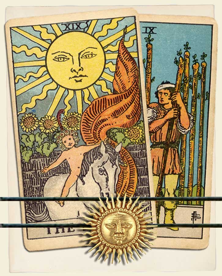The Sun and Nine of wands together means that two forces: (1) Happiness and (2) Last Stand (influence of Nine of wands) are at play today. What’s the advice of this pair? The Sun represents a new beginning after a difficult period in your life. It is an energy that will bring happiness to you because it allows you to start over with a clean slate. The Nine of wands indicates that there may be something holding on too tightly in your life, preventing you from moving forward. This card often indicates someone who thinks they have been wronged or treated unfairly, so they refuse to leave the situation alone. If this is the case for you, take heart in knowing that whatever “victory” you achieve won’t come at another person’s expense.