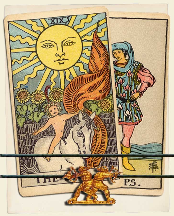 The Sun and Page of cups combination means that two mystic forces: A) VITALITY (The Sun) and B) SENSITIVITY (Page of cups) are exerting their influence on your life’s choices. What’s the advice of this pair? The Sun represents a powerful source of energy that will allow you to get things done. It is also an arrogant, egotistical energy that can be self-serving. Under this energy people often feel as if they have too much ego in their lives and need to rein it in. The Page of cups indicates that there may be something delicate or emotional at stake for you, because under this energy people tend to act more emotionally than rationally. This makes them seem weak or even naive, so others may take advantage.