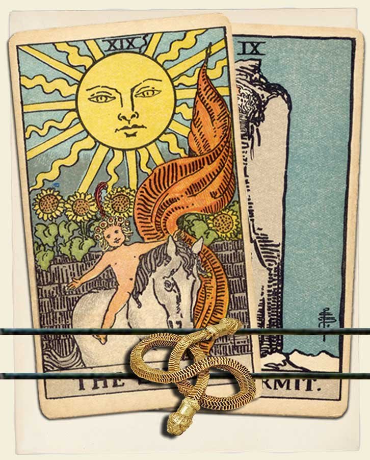 The Sun and The Hermit combination signals that two tarot influences: 1) Positivity (influence of The Sun) and 2) Being Alone (influence of The Hermit) are a guiding force on your decisions. Those cards together offer you a warm balance of peace and confidence, as you find your feet after a painful time. It’s OK to be still and present, as sometimes we need to embrace those moments and contemplate our next step.