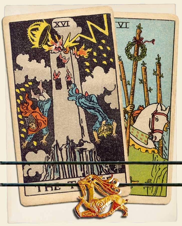 The Tower and Six of wands tarot combination means that two mystic forces: 1) Sudden Change and 2) Victory are influencing you at the moment. What’s the advice of this pair? The Tower represents a profound change in your life, often brought on by an intense emotional shock. This energy can be very destabilizing, so it is important to take care not to let things fall apart under this sudden new direction in your life. The Six of wands indicates that you will have plenty of allies during this time who want to help keep things stable for you as you navigate through the changes caused by the Tower. Be sure to listen carefully and accept their support.