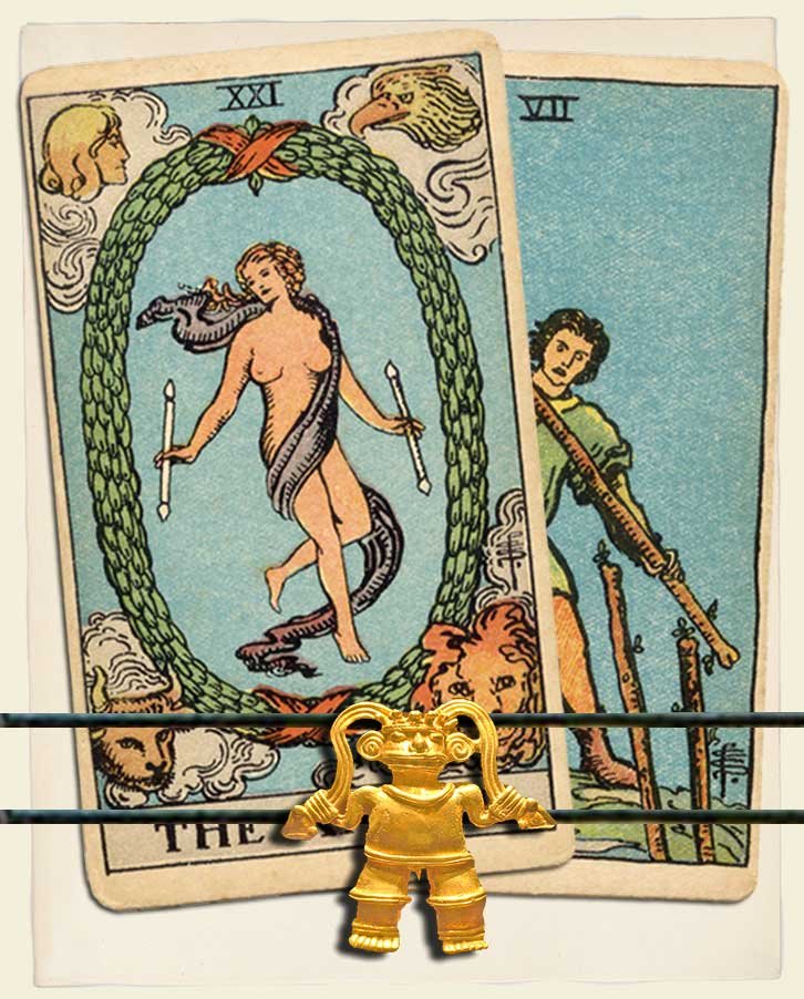 The World and Seven of wands tarot combination is an omen that two arcane effects: 1) Harmony (from the World) and 2) Stamina (Seven of Wands) together are exerting influence on you. To put it differently, a new love will soon lead you to take bold, defensive action. Someone in your inner circle will soon be critical of your new love and you will quickly spring to your lover’s defense. This season will see you drawing closer to your love as a result.