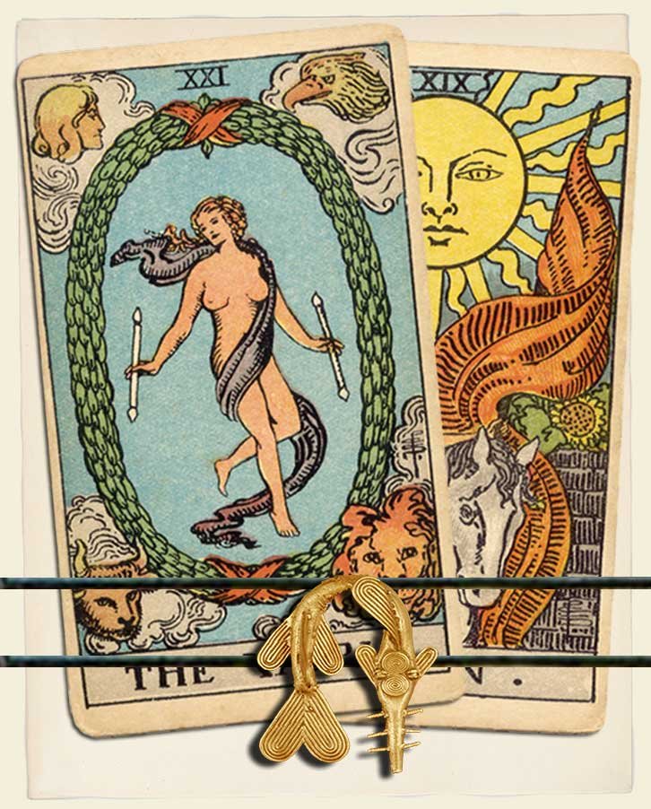 The World and The Sun combination gives a glimpse into your near future. It will come to pass from the combined effect of (1) Wholeness (effect of The World) and (2) Warmth (effect of The Sun). What’s the advice of this pair? You are in an important place in your life, where you feel whole. This is a good time for relationships that have been going through tough times to get back on track. There is also something about yourself or your environment that makes you warm inside, as if by some internal sun. This can be a powerful energy, but it can also burn out people who aren’t ready for it. Be careful not to let things go too far before they heat up again.