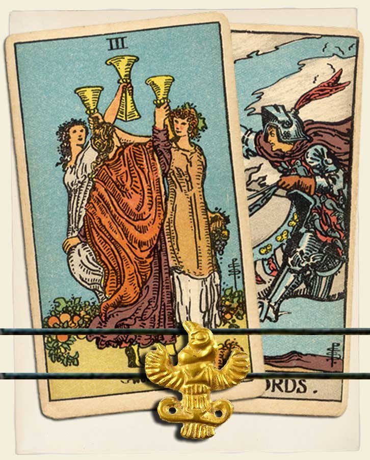 Three of cups and Knight of swords combination indicates that two tarot influences: 1) Friendship and 2) Assertive are affecting you in this card reading. Do not hesitate any longer to say hello to the person you recently made eye contact with. The cards do not reveal if they will be a new love or perhaps just an ally. But this person has inner gifts to share, and if you take the time to know this person you will soon be enriched by their friendship. Take the initiative and ask them to have coffee or a drink, you won’t regret it.