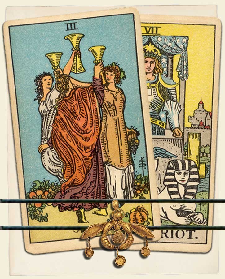 Darling, let me break it down for you. The Three of Cups and The Chariot combination is a bit of an enigma when it comes to love and relationships. On one hand, we have the influence of celebrations and success which screams out that it’s time to let your hair down and party! This could mean that you or someone close to you has been holding onto a secret but now the good news is out, so grab your little red dress and hit the town with your besties.