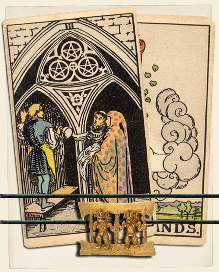 Well, my dear, if you’re asking about the meaning of Three of pentacles and Ace of wands for love and relationships, I must say it’s a rather undetermined sign. However, this combination does give us hints about our medium-term future guided by the influences of implementation and new initiative as clarified by Ace of Wands. Tarot readers often consider this reading as a sign to take action.