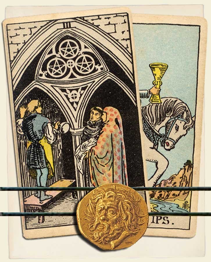 Three of Pentacles and Knight of Cups combo interpretation