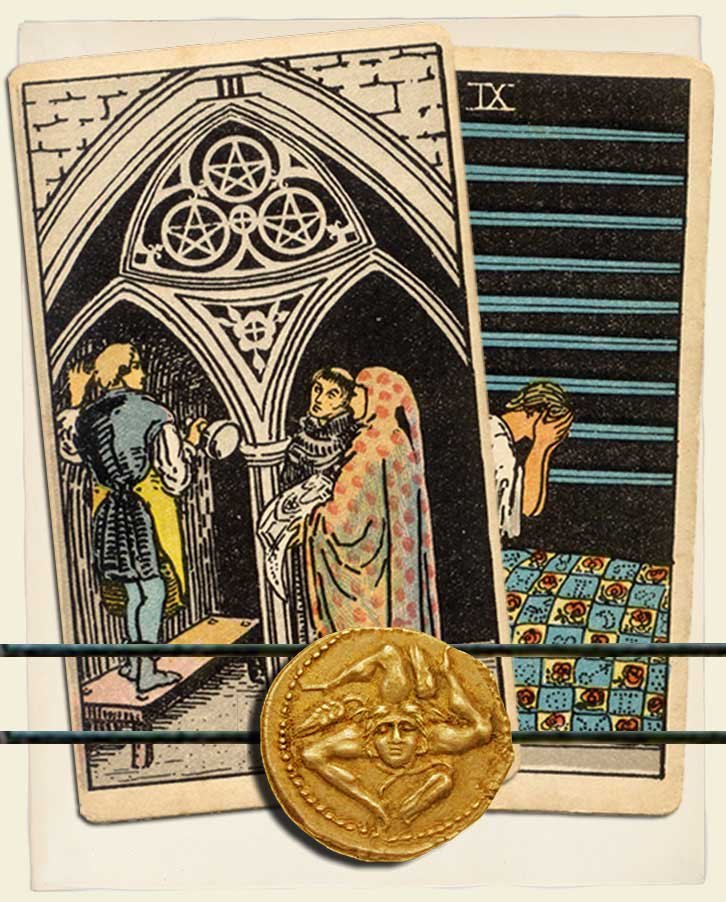Three of pentacles and Nine of swords combination is an omen that arcane tarot forces: A) Teamwork (Three of pentacles) and B) Fear (Nine of swords) together are exerting influence on you. How to interpret this in practice? The Three of pentacles represents working in concert with others to achieve a common goal. This requires trust, which can be hard when the Nine of Swords indicates there is fear present. You may feel as if your colleagues are holding back information from you or even sabotaging your work, so it’s important not to let paranoia get out-of-hand. Ask questions and listen carefully for the truth, because at least now they’re being honest with you about their fears.