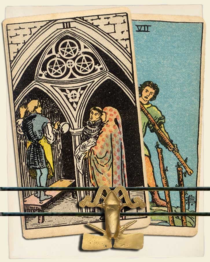 Three of pentacles and Seven of wands combination is a sign that two mystic forces: 1) Teamwork and 2) Perseverance are at play. You may have been working on something for a long time, but it seems like you’re just not getting anywhere. Maybe it was your idea in the first place, or maybe you were doing most of the work, but now that you’ve exhausted all possible solutions to the problem at hand, someone else has come up with an alternative solution that could help get things moving again. It would be easy to dismiss this as wishful thinking or even paranoia—but if there is any hope left, why not take advantage of it?