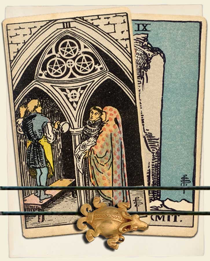 Three of pentacles and The Hermit combination means that two mystic forces: 1) Collaboration and 2) Soul-Searching are altering your life path at this reading. To put it differently, it means that if you are doing some soul-searching, and having a hard time with it by yourself. Having someone help and guide you on the journey will help you stay on point and keep from being distracted from your work. Some people work well by themselves, but others need some help staying on task, as well as having someone there to help create a starting point.
