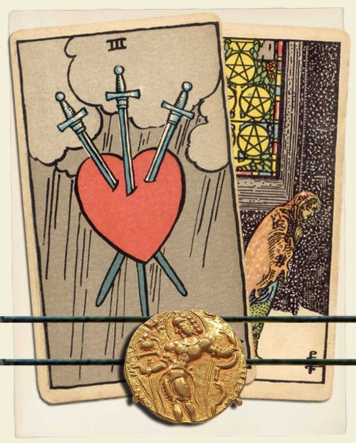 Three of swords and Five of pentacles combination gives you a divination about your medium-term future, which will come to pass from the combined effect of (A) Emotional Pain (effect of Three of swords) and (B) Hardship (effect of Five of pentacles). How to interpret this tarot combination in practice? Going through emotional pain in the form of a break up, backstab or a loss of a loved one is bad enough, but you are also about to go through a lot of hardship as well. This one thing has started a cycle of bad luck that is hard to break out of. You are going to spiral, and it’s going to be a hard ride. And you are going to have to ride it out, because like all things, nothing lasts forever.