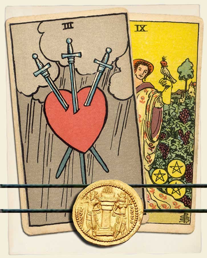 The combination of Three of swords and Nine of pentacles in a love reading is not favorable. These cards suggest that an event involving separation and independence is looming in your future, which means you will reap what you sow. The level of freedom and security you crave is a direct result of the amount of self-discipline, hard work, and commitment you put into your future and dreams.