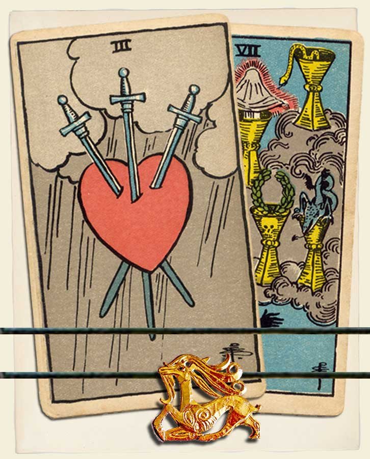Three of swords and Seven of cups combination means that two arcane forces: 1) Emotional Pain and 2) Illusion govern your life decisions today. It is hard to see past the pain when you have been hurt, but it is important. You need to look at what has happened objectively so you can move forward without getting stuck in a painful situation that will only lead to more problems down the road. The Three of Swords indicates that there are conflicting emotions around this situation, but if you want to get out unscathed, it might be best not to dwell on those feelings too much. The Seven of Cups represents walking away from something good for nothing in return. This may seem like an illusion or maybe even a waste of time, but it isn’t really either one because…