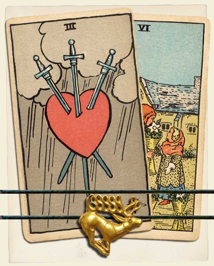 Three of swords clarified by Six of cups means that two mystic forces: 1) HEARTBREAK and 2) FAMILIARITY are exerting their influence on your life’s choices. What does it mean? It is time to retire from a situation or relationship that has been hard on you, because the Three of Swords indicates that there will be serious consequences if you stay. This may be an ex or a friend who has hurt you, but whatever the case, this feeling won’t go away easily. You have invested too much into this situation for it to end in disaster. Take care of yourself and get some distance before making any final decisions.