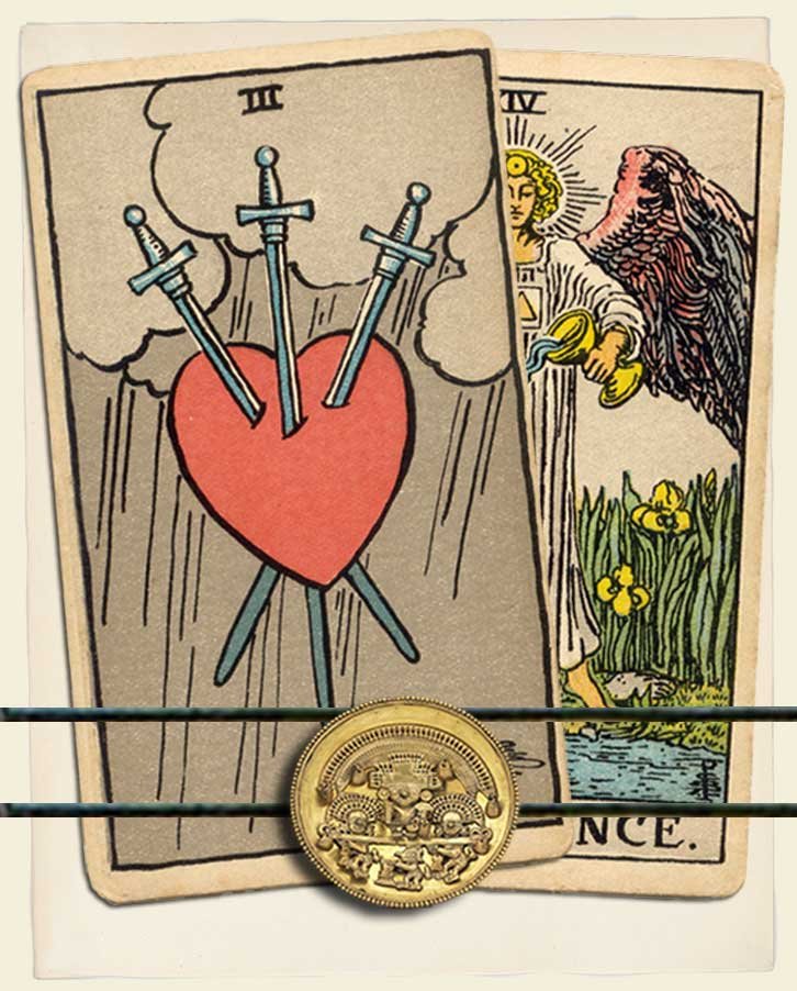 Three of swords and Temperance combination gives a glimpse into your distant and barely discernible future. It is influenced by the tarot forces of (I) Separation (from Three of swords) and (II) Moderation. What’s the advice of this pair? The Three of Swords represents walking away from something you might have been wrong about, so you can find true happiness. This card indicates that there may be some difficult conversations or separations happening around you right now that will allow for growth to occur in your relationships. The presence of Temperance indicates that these changes won’t be easy, but they will lead to lasting stability in your life.