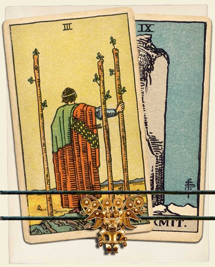 Three of wands and The Hermit combo indicates that two tarot influences: 1) Foresight and 2) Being Alone are altering your life path today. It is time to take stock of what you have done, where you are going, and who you need to talk to about it before moving forward with any plans for the future. This could be a period of reflection or perhaps an internal dialogue about yourself, but whatever it is, it will require some solitude. You may find this difficult right now because there is much on your mind, but if you can hang out here just a little while longer without getting too lonely, things should improve soon enough.