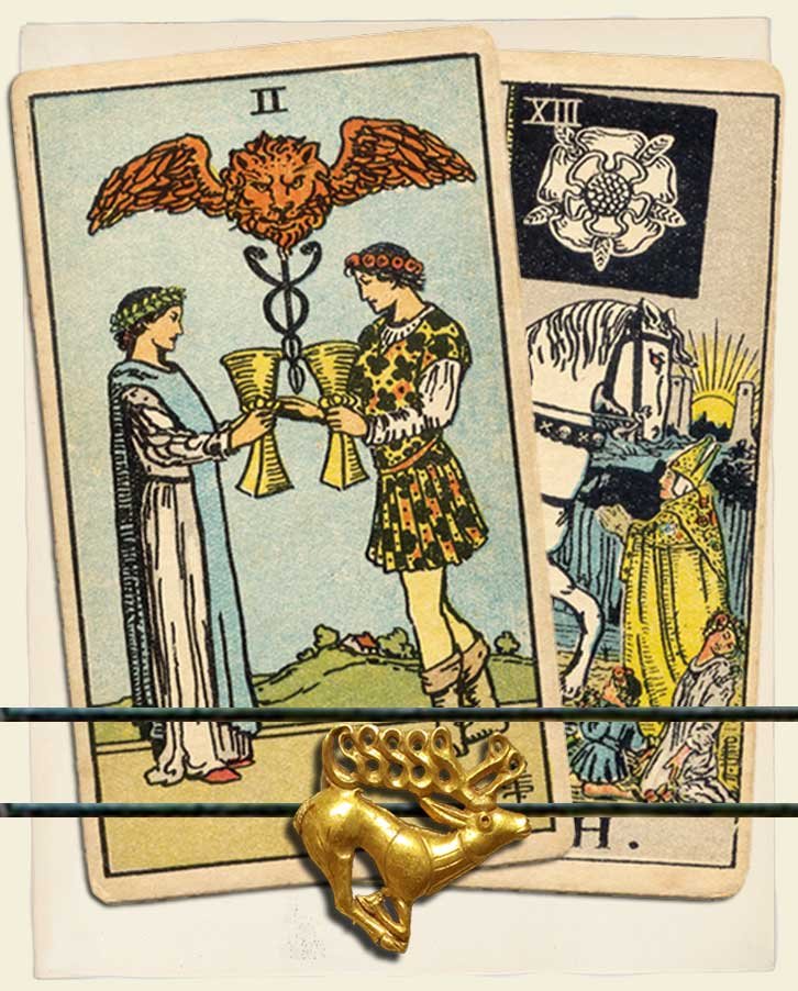 Two of cups and Death combination provides an insight into your near future. It is influenced by the arcane forces of (A) PARTNERSHIP and (B) CHANGE. What’s the advice of this pair? The Two of cups represents a partnership that is equal, balanced, and fair. This card indicates that you may be in such a relationship or want to create one. If so, it will have to change as circumstances shift under the influence of Death – something very difficult for most people to do. You must face some hard truths about yourself before you can move forward with any changes you make in your life. This combination of cards urges you not only to consider making changes but also makes clear that they are necessary before anything positive can happen in your life.