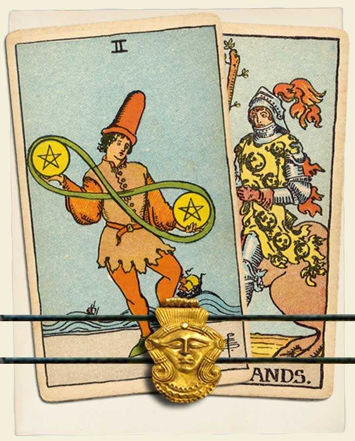 Two of Pentacles and Knight of Wands combo interpretation