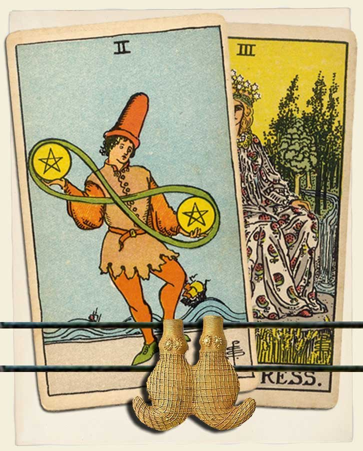 Two of pentacles and The Empress combination means that mystic tarot forces: 1) Stretching Resources and 2) Nature are currently influencing you. In essence, you are being called to infuse more passion and wonder in your pursuits. No matter if it’s for your career or home life, it is time to find the ordinary pleasures in the work you do. Life doesn’t have to become overly practical and mundane to remain productive to society. You are being encouraged to incorporate your own pleasures and desires into the juggle of life’s priorities.