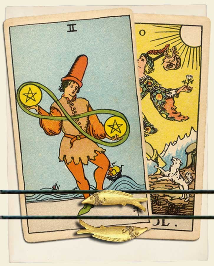 These cards speak to us of balance and beginnings. When we embark upon a new relationship or project, it is important to find balance between our old responsibilities and our new passions. It may not be easy, but with dexterity like that of the Two of Pentacles, we can learn to juggle all that life throws at us.