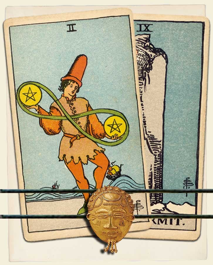 Two of pentacles and The Hermit combination gives you a hint about an event in your future, which will come to pass from the combined effect of (A) Balancing Resources (effect of Two of pentacles) and (B) Being Alone (effect of The Hermit). You are trying to compile the sources you have about a topic you are researching. Sometimes you seem very confused. You feel lonely and you are affected by this. You can’t make up your mind and your rational behavior will help you.