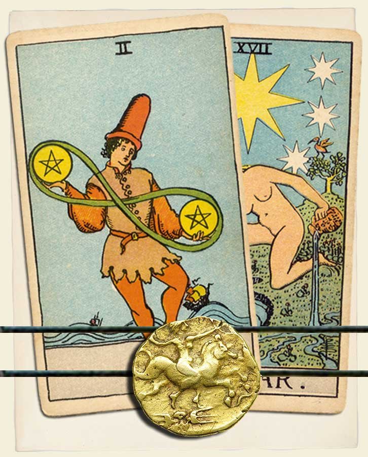 Two of pentacles and The Star tarot combination gives you a hint about your distant and barely discernible future, which will come to pass from the combined effect of (1) RESOURCEFULNESS (effect of Two of pentacles) and (2) HOPE (effect of The Star). This combination tells me that you need to make a decision. When making a choice, you should be careful to take a step forward instead of making it more difficult. Open yourself to new things. Who knows, maybe beauty you can’t even imagine is hidden behind a door you are afraid to dare. Oh, I never asked what do you think is behind the door? The melody I heard reminded me of a beautiful love story.