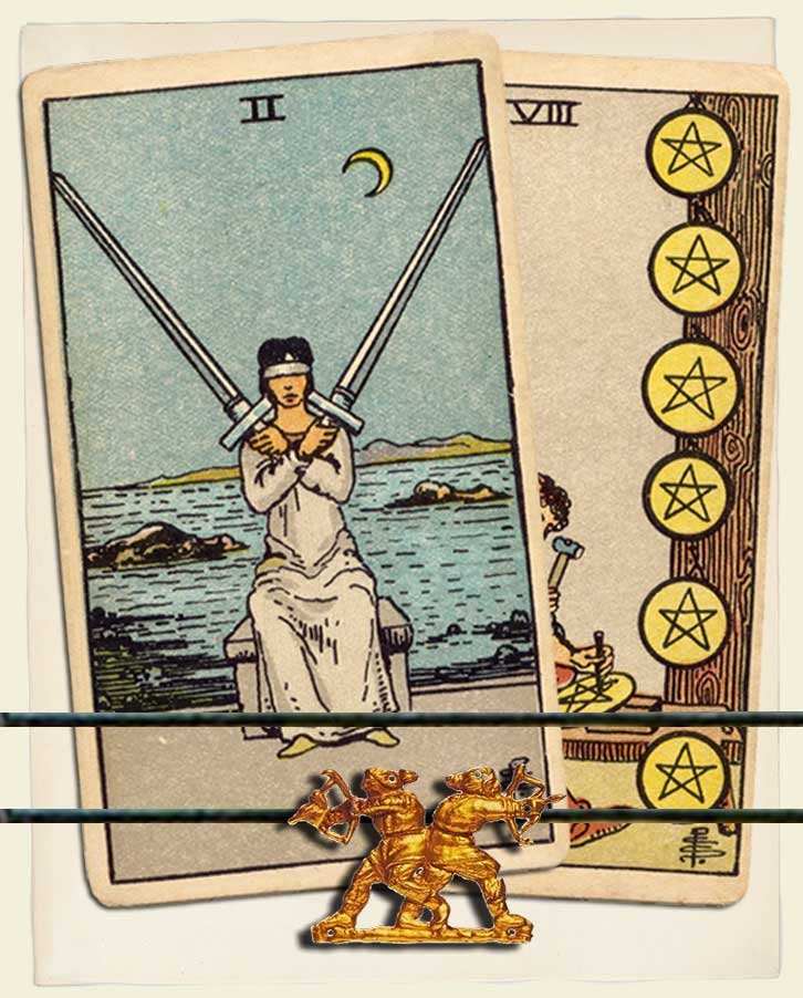 Two of swords and Eight of pentacles combination indicates that two tarot influences: 1) Stuck In The Middle and 2) High Standards are affecting you at this moment. It seems like you have been stuck in the middle of having high standards and getting things done right the first time you try it. Maybe you think that lowering your standards and taking a chance on something that you wouldn’t think that you wanted is a big risk. Sometimes the risk may be worth it.
