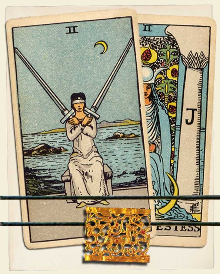 Two of swords and The High Priestess tarot combination means that two tarot influences: A) Avoidance (Two of swords) and B) Mystery (The High Priestess) are at play today. This can mean you may be actively avoiding making a decision, or that you are not listening to your intuition. The 2 of Swords shows someone stuck between two choices, unable to see how to proceed. The knowledgeable High Priestess asks that you lean into the unknown, and trust in yourself to make the best choice for you in this situation.