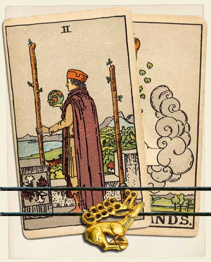 Two of wands and Ace of wands combination means that two arcane forces: A) Decisions (Two of wands) and B) Inspiration (Ace of wands) currently guide your decisions. In other words, you will find creative success in the coming months. Still, the form it will take may surprise you. Think of it this way: faced with unlimited choice, the creative will becomes paralyzed. So, what are you waiting for? Make a decision. Your imagination will flourish once you do.