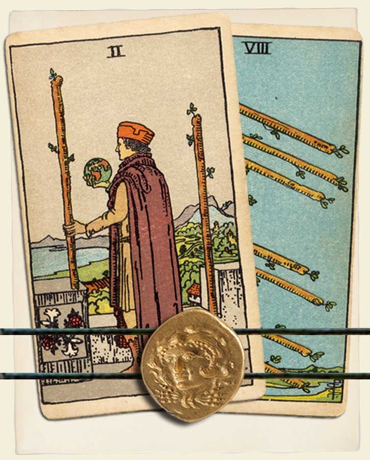 Two of wands and Eight of wands combination means that tarot influences: (1) Decisions and (2) Air Travel (influence of Eight of wands) are jointly affecting you today. You think you’ve made your own world rules and you’ve gotten over everything, but you’re still feeling the effects of things that happened in the past. You’re secure but you’ll soon encounter some minor setbacks. It’s good to be cautious and think twice before taking the plunge, especially choosing to believe what you see and not what you hear from people.