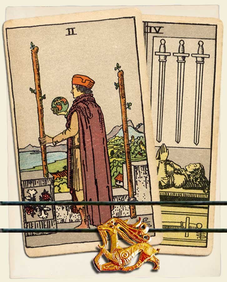 Two of wands and Four of swords together means that arcane tarot forces: A) Planning (Two of wands) and B) Relaxation (Four of swords) currently guide your decisions. What’s the advice of this pair? The Two of wands is a card that indicates preparation for an important journey. You have something you want to achieve, but it requires some planning. This energy can be overwhelming, though, so the Four of Swords is here as well. It represents rest and rejuvenation after a long period spent working hard on something difficult or stressful. Take advantage of this time to take stock and make sure all your ducks are in line before you set out on your next phase in life.