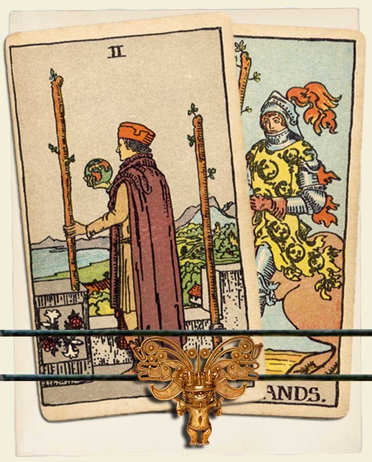 The Two of Wands and Knight of Wands tarot combination is a mix of future planning and charm. The advice given by this pair is to take advantage of any goodwill around you, use all available resources effectively, weigh the pros and cons before making decisions, trust yourself, be authentic, keep your promises to yourself, get rid of doubt, and move forward.