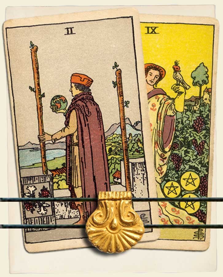 The Two of Wands and Nine of Pentacles combination is an acceptable sign for love and relationships. This reading suggests that the forces of progress and rewarded efforts are changing your life path in matters of the heart. The opportunities presented to you should be carefully considered before seizing them, as they have the potential to bear noble fruit.