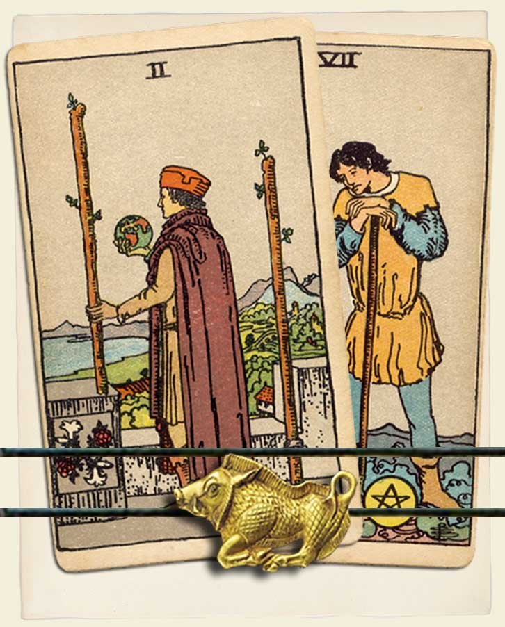 Two of wands and Seven of pentacles combination provides an insight into your near future, which is influenced by the arcane forces of (A) Planning and (B) Investment. What does this card combination mean for you in practice? In a nutshell it shows that you would do well to think about exactly what you want now and how you intend to get it. Careful planning at this time is the key to creating the outcome you want. This means setting small achievable goals and then reaching for them consistently come rain or shine. Prepare your ground before you plant your seeds, and your efforts will yield the results you desire in measurable increments.