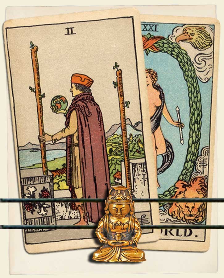 Two of wands and The World tarot combination gives an insight into a major event in your future. It is influenced by the arcane forces of (A) IMPROVEMENT and (B) HARMONY. To put it differently, it gives you a sign that new things are possible, even probable, and these new horizons are leading you to a more complete sense of the life-altering accomplishment that is found in the World card. Now, you probably don‘t know yet what that accomplishment is. This will take time, but you are on the path to great things, and you will, one day, look back on this time and shake your head in wonder.