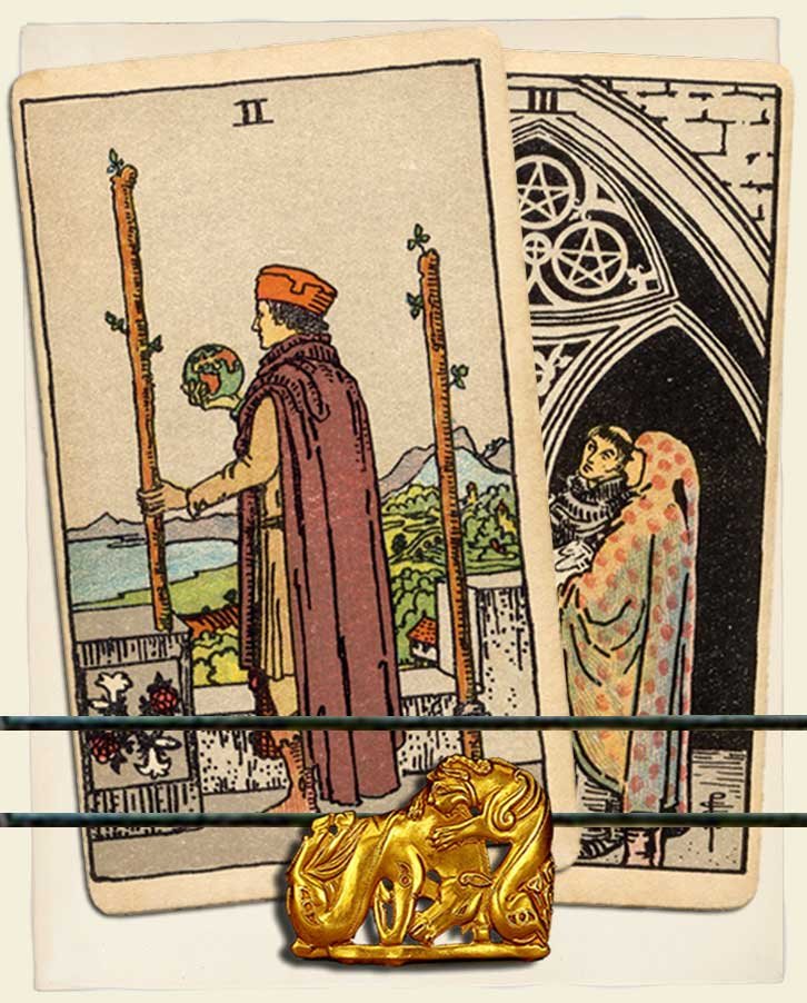 The combination of Two of wands and Three of pentacles is not a straightforward sign for love and relationships. It signifies that the prevailing state and close future are directed by the guiding influences of future planning and learning, respectively. This suggests that you are waiting for your work to be finalized before drawing a new route in your relationship. The outcome could go either way – you might lose a person or realize that you can trust them more.