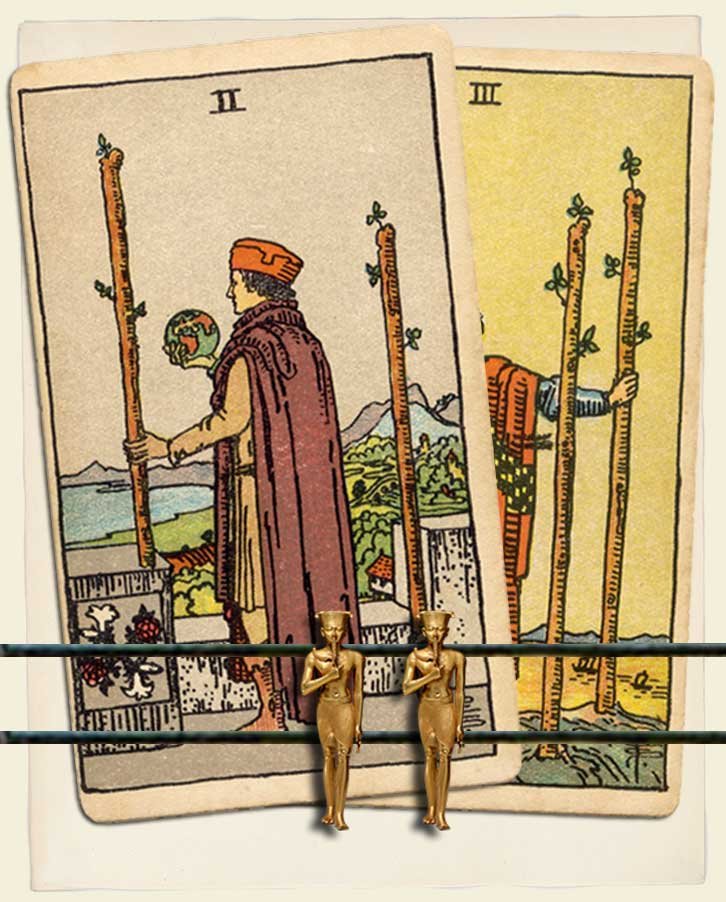 Two of wands and Three of wands combination means that two tarot influences: 1) Future Planning and 2) Overseas Opportunities guide your decisions today. You have a lot on your plate right now, but don’t worry. This is just the beginning. There are more cards to come that will help you take this project or opportunity to another level, so don’t give up yet. The Two of Wands indicates that you have all the information you need at hand, even if it might be buried in some dusty file cabinet somewhere in your mind where everything is still clear as crystal for now. Just get out those files and pull them together before moving forward again.