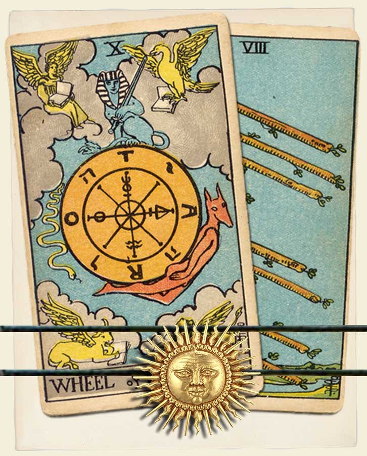 Wheel of Fortune and Eight of wands together is an omen that two mystic forces: 1) Fate and 2) Air Travel govern your life perception today. What does it mean? You are riding in a first-class seat to the unknown, keeping your head in the clouds, thinking about the future. Because of this tunnel vision, write down any obligations you have to help keep yourself on track. Enjoy the ride because today will fly right into tomorrow.