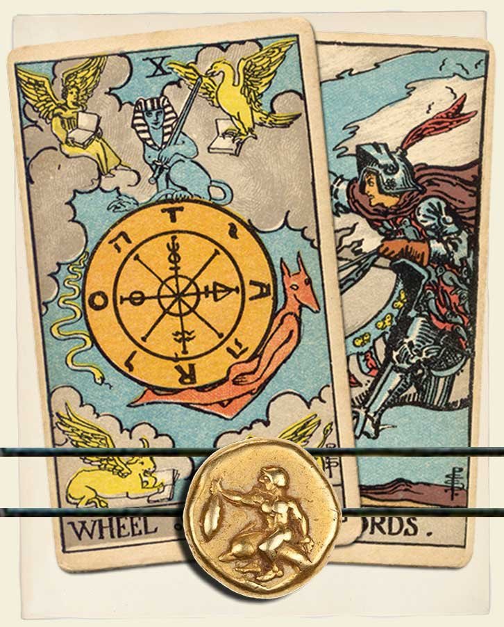 Wheel of Fortune and Knight of swords combination is an omen that two arcane dynamics: (1) Destiny and (2) Focused (influence of Knight of swords) drive your choices at this moment. Most tarot readers would consider this a sign of some turbulence coming up your way in the next future. This doesn’t mean necessarily bad omens: the outcome of some situations will be determined by your ability to concentrate and keep your course steady. It’s easy to lose the sense of direction in the chaos of the storm, all of your mental strength is required in the coming days.